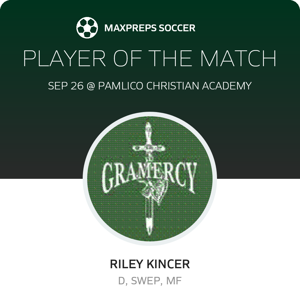Congratulations to #20 Riley Kincer for being selected the Gramercy Christian Soccer Player of the Match.