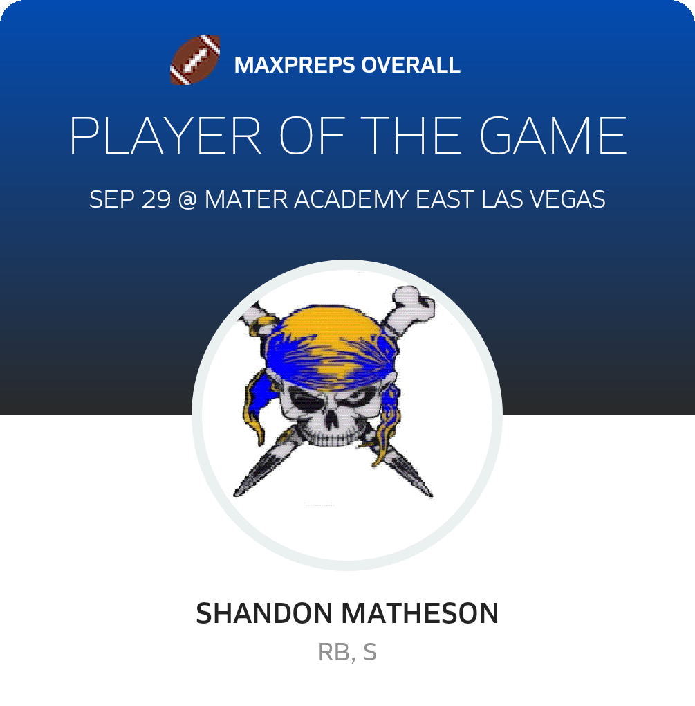 Congratulations to #1 Shandon Matheson (overall), #9 Talon Schraft (offensive), #8 Gavyn Frederick (defensive) and #10 Cash Keller (special teams) for being selected the Moapa Valley Football Players of the Game.