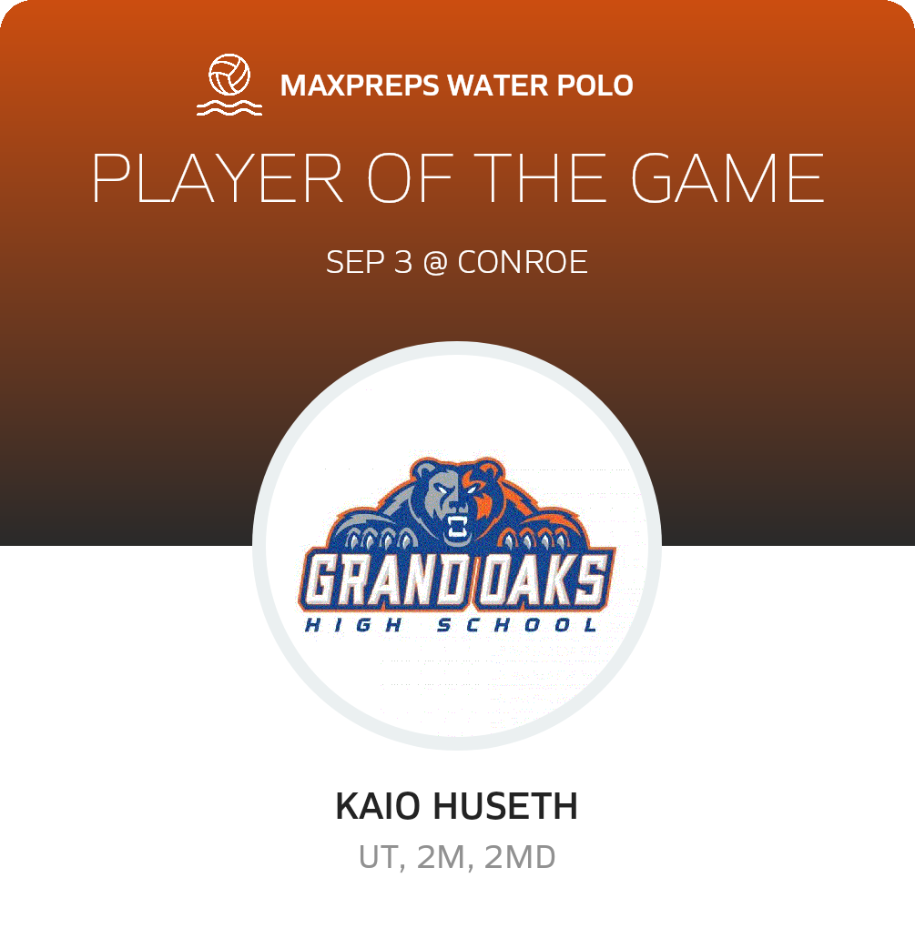 Congratulations to #12 Kaio Huseth for being selected the Grand Oaks Water Polo Player of the Game.