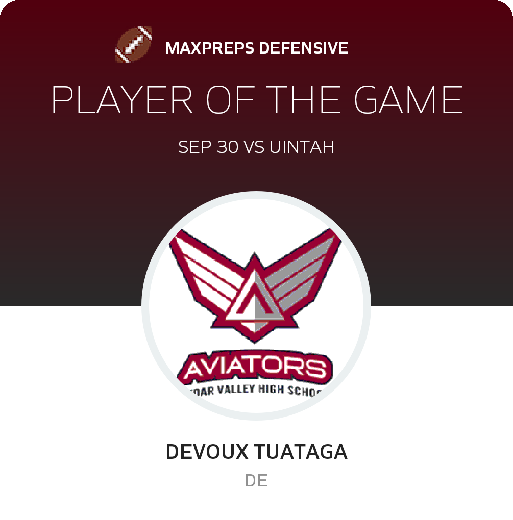 September 30, 2022: Eagle Mountain, UT 84005 In Friday's league game, the Cedar Valley Aviators (Eagle Mountain, UT) football team were victorious over the visiting Uintah Utes (Vernal, UT), by a score of 31-11.