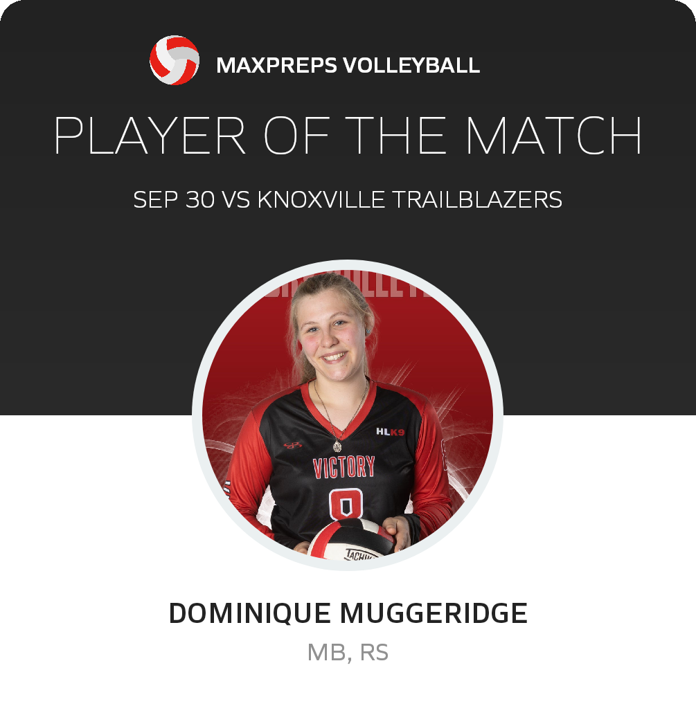 Congratulations to #8 Dominique Muggeridge for being selected the Fredericksburg Victory Volleyball Player of the Match.