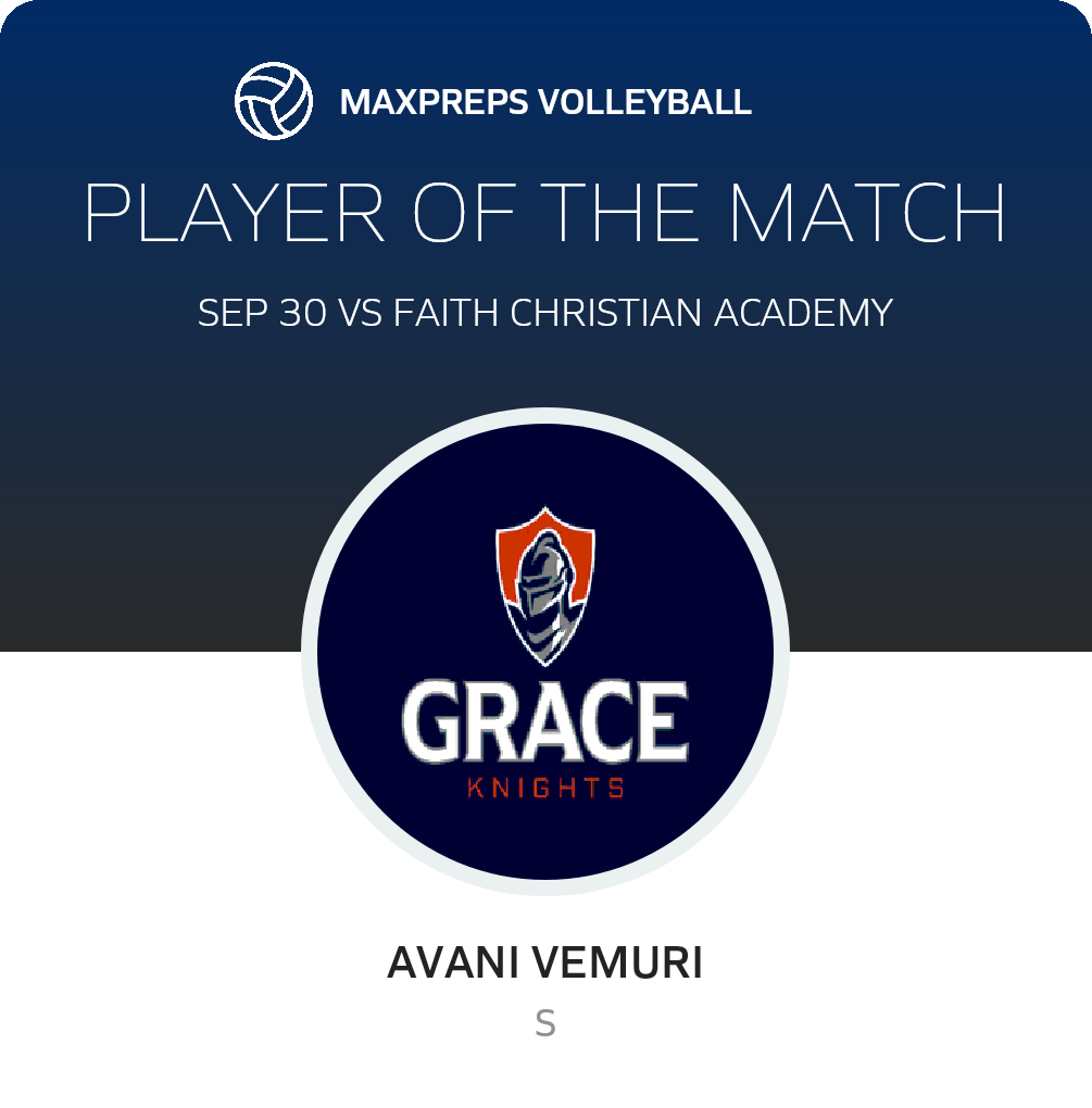 Congratulations to #1 Avani Vemuri for being selected the Grace Academy Volleyball Player of the Match.