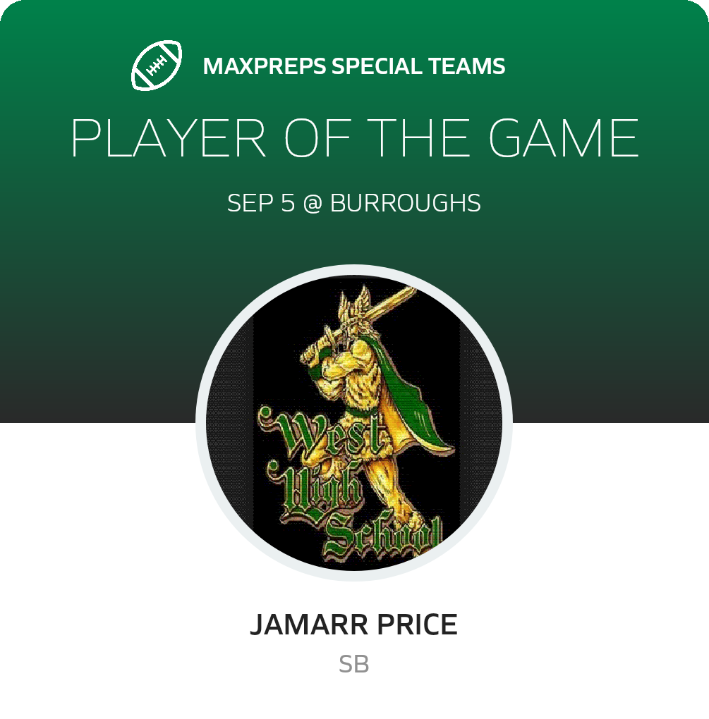 Congratulations to #1 Carlos Real (overall), #26 Jamarr Price (offensive and special teams) and #6 Victor Bernal (defensive) for being selected the West Football Players of the Game.