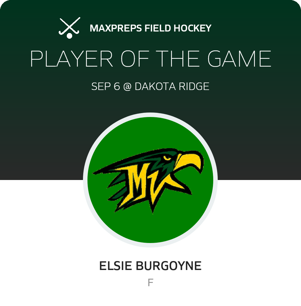 Congratulations to #18 Elsie Burgoyne for being selected the Mountain Vista Field Hockey Player of the Game.
