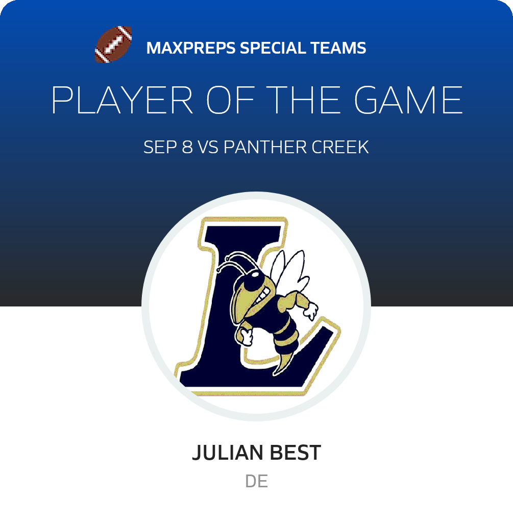 Congratulations to #1 Sergio Castellon (offensive), #9 Trajen Odom (defensive) and #82 Brendan Whittaker (special teams) for being selected the Panther Creek Football Players of the Game.