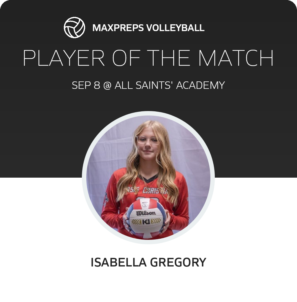 Congratulations to #23 Isabella Gregory for being selected the Oasis Christian JV Volleyball Player of the Match.