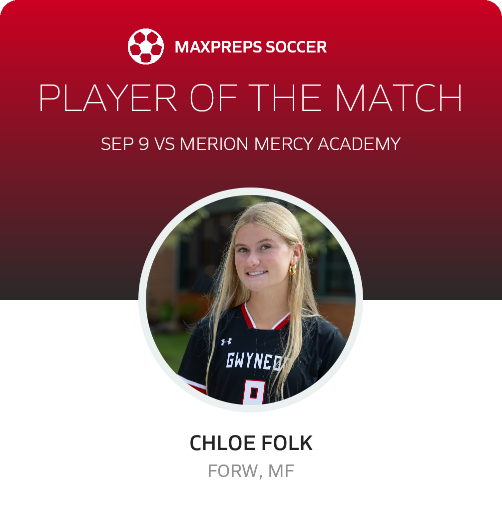 Congratulations to #8 Chloe Folk for being selected the Gwynedd Mercy Academy Girls Soccer Player of the Match.