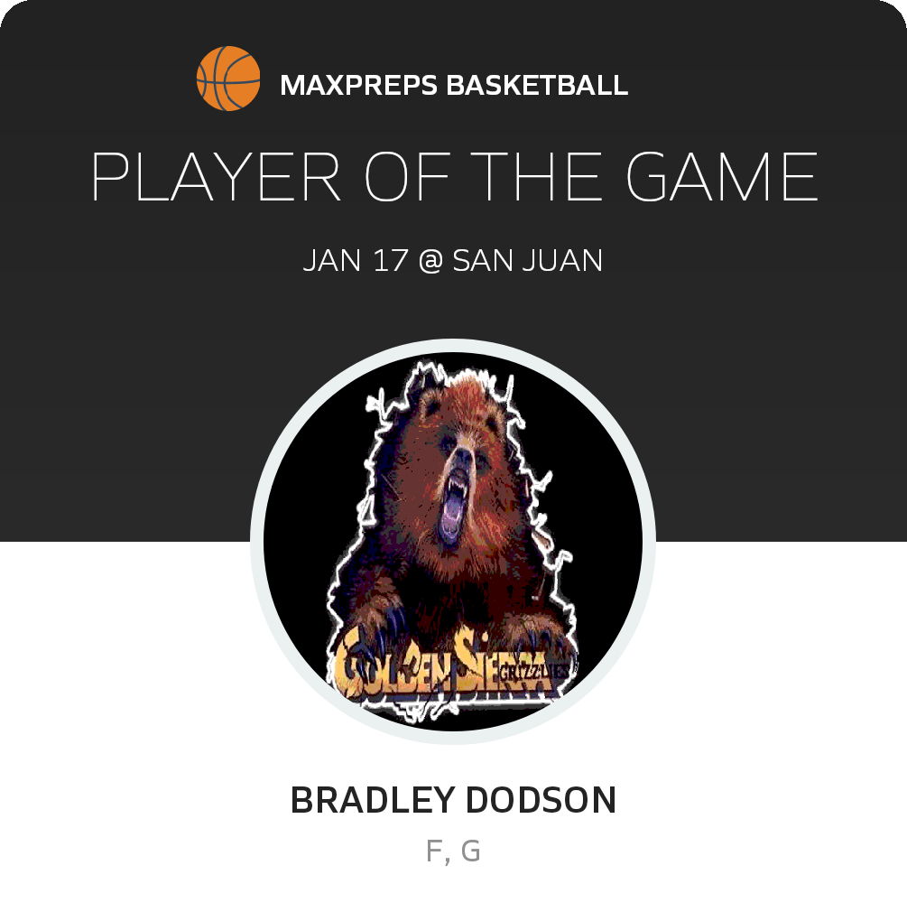 Congratulations to #21 Bradley Dodson for being selected the Golden Sierra JV Basketball Player of the Game.