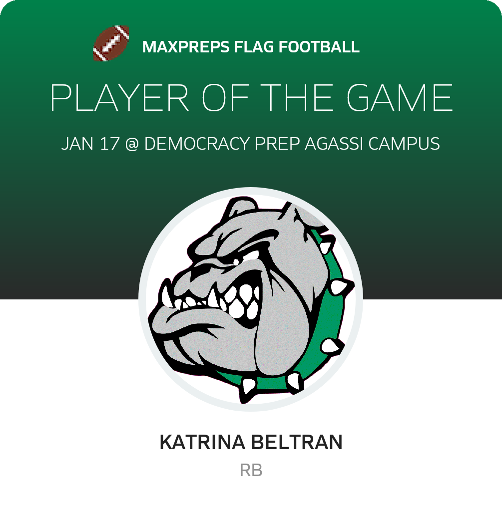Congratulations to #3 Katrina Beltran for being selected the Virgin Valley Girls Flag Football Player of the Game.