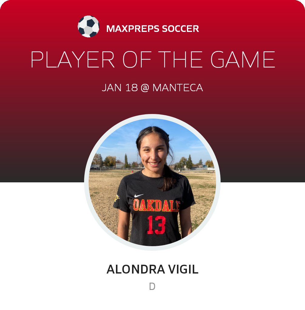 Congratulations to #13 Alondra Vigil for being selected the Oakdale Girls Soccer Player of the Match.