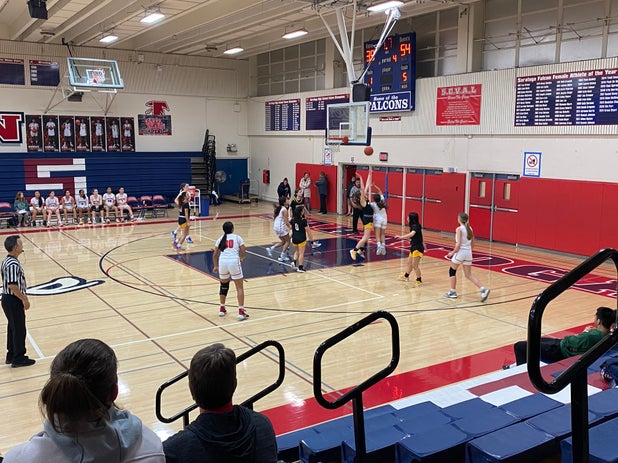 In Wednesday's league match, the visiting Mountain View Spartans basketball team scored a good 54-41 triumph over the Saratoga Falcons.