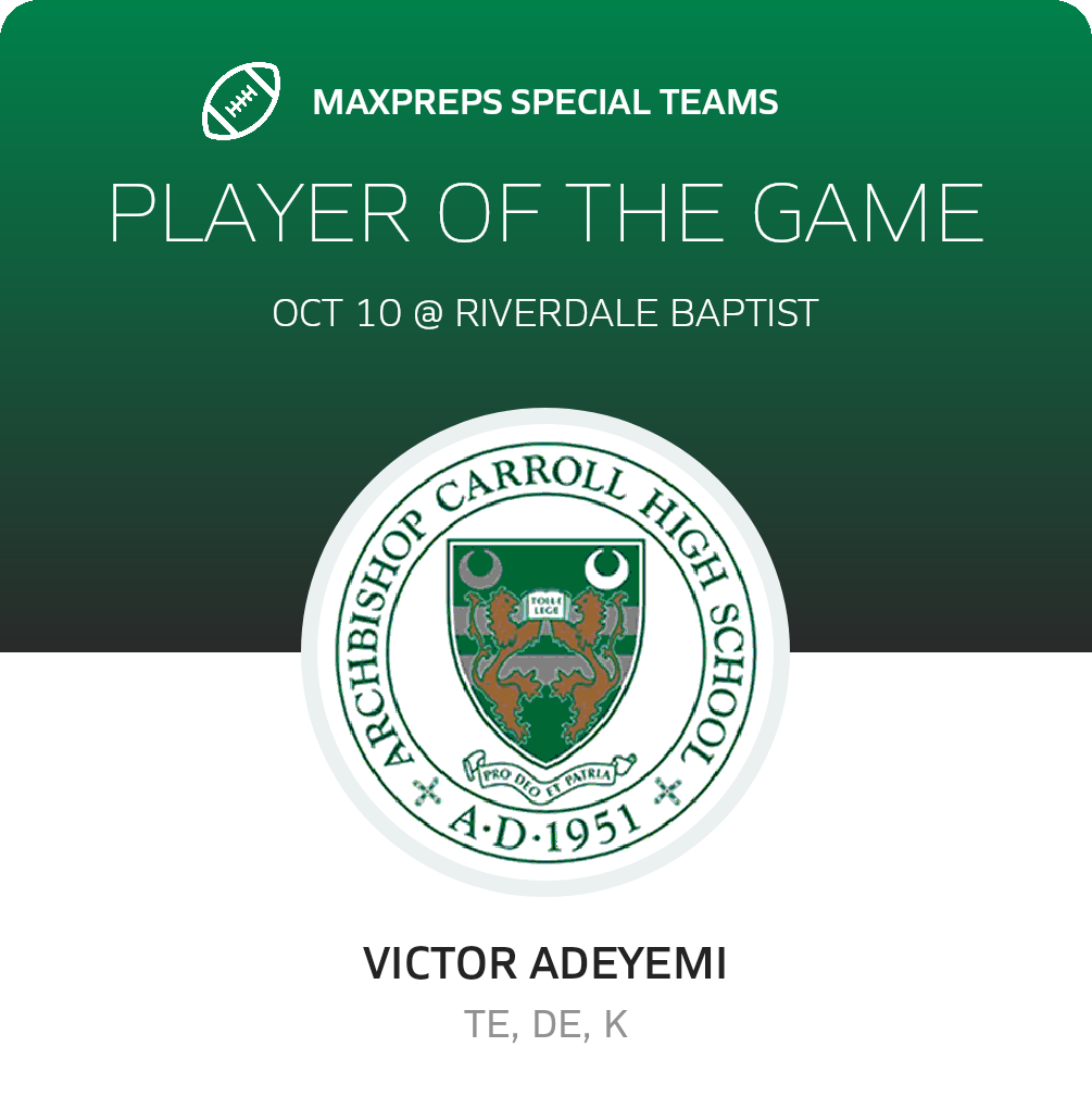 In Friday's non-league game, the Archbishop Carroll Lions (Washington, DC) football team triumphed over the host Riverdale Baptist Crusaders (Upper Marlboro, MD), by a score of 57-18.