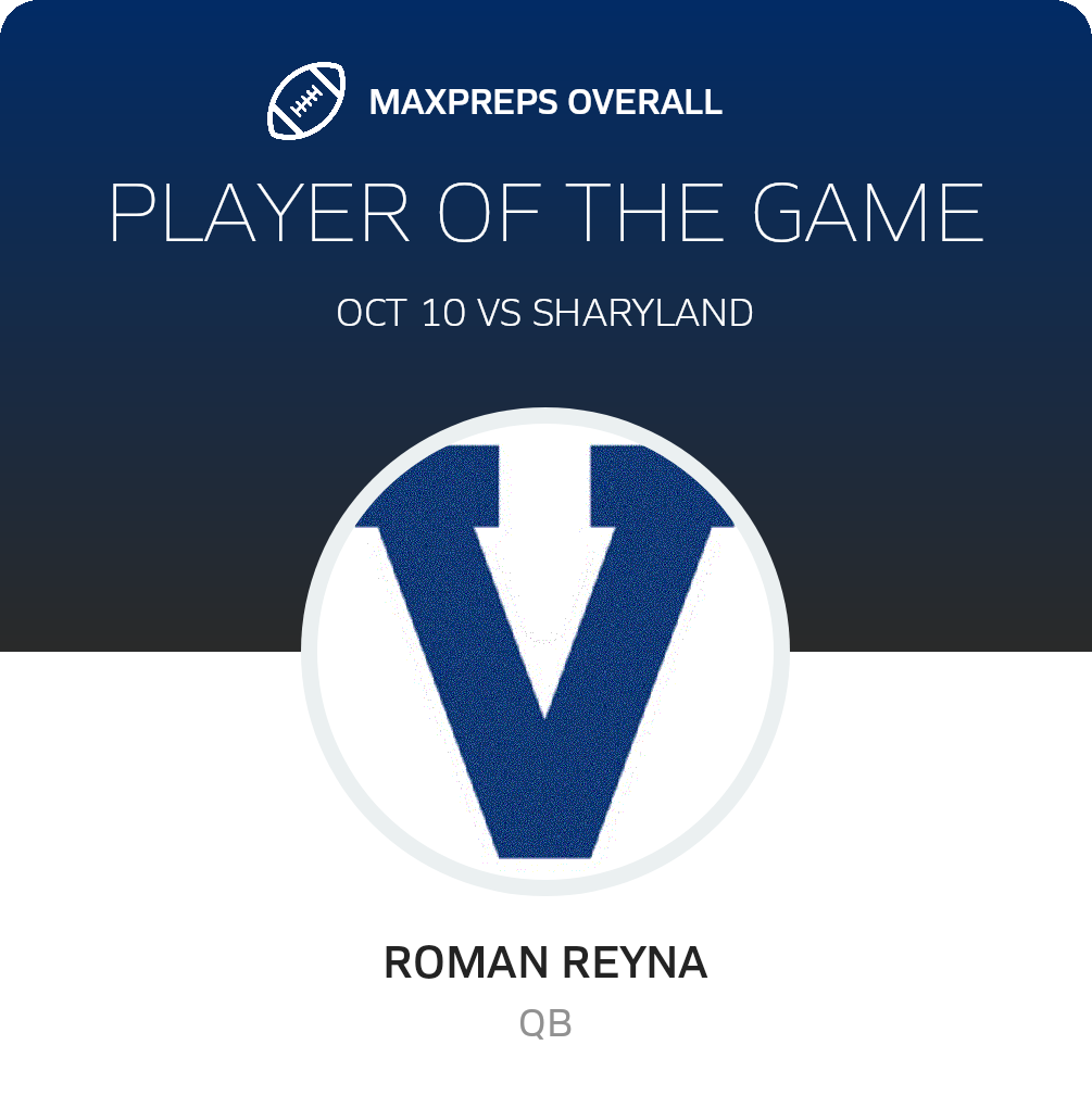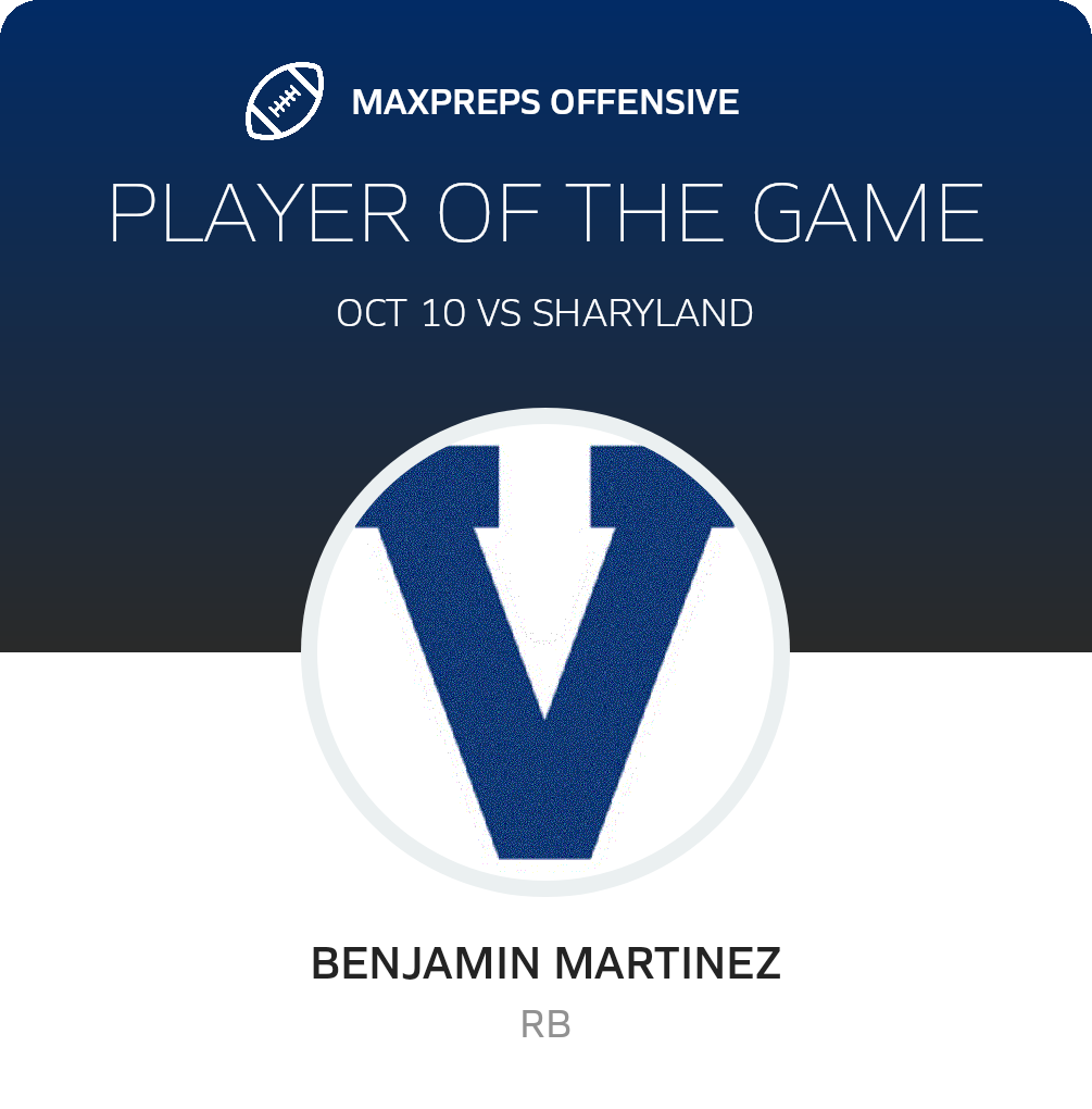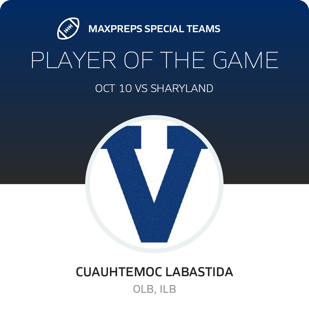 Congratulations to #7 Roman Reyna (overall), #23 Benjamin Martinez (offensive) and #8 Cuauhtemoc Labastida (defensive and special teams) for being selected the Mission Veterans Memorial Football Players of the Game.