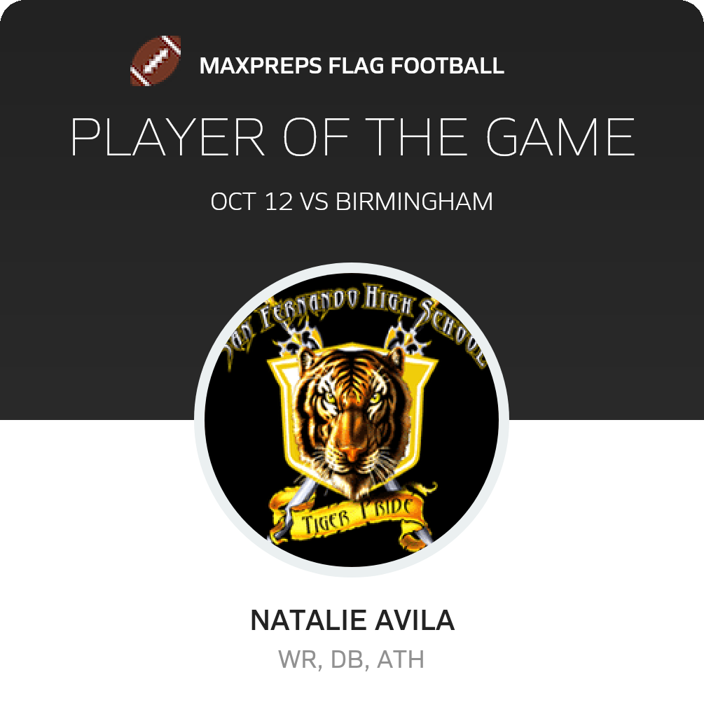 Congratulations to #2 Natalie Avila for being selected the San Fernando Girls Flag Football Player of the Game.