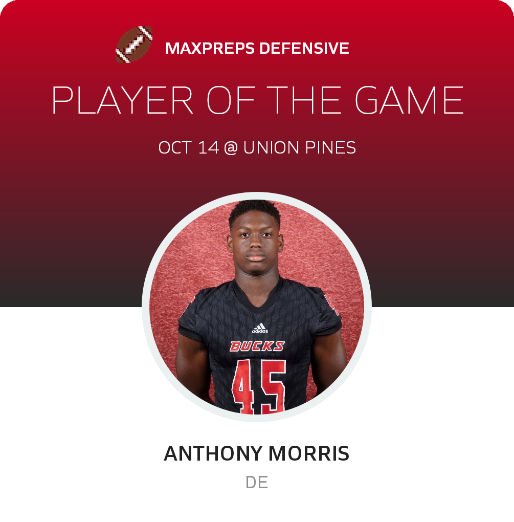 The Bucks (5-4) will now prepare for their game against Pinecrest (Southern Pines, NC). The Patriots come into the 3A/4A East Conference 24 game with a 6-2 record. In their last game, Pinecrest knocked off Scotland (Laurinburg, NC), 30-21, in a league game.