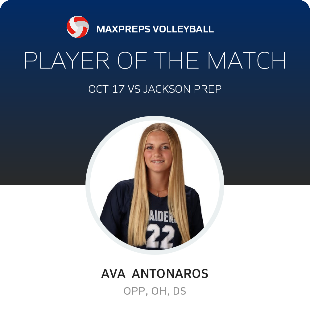 Congratulations to #22 Ava Antonaros for being selected the Jackson Academy Volleyball Player of the Match.