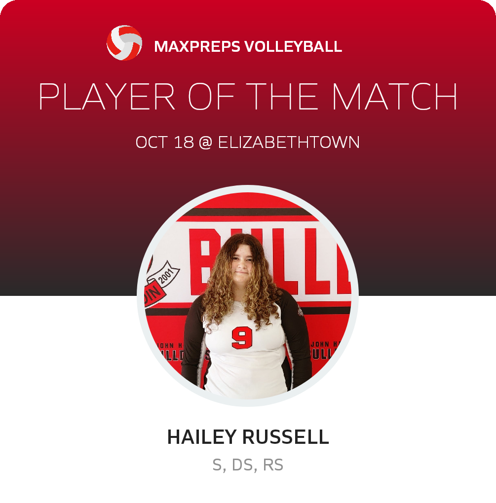 Congratulations to #9 Hailey Russell for being selected the John Hardin Volleyball Player of the Match.