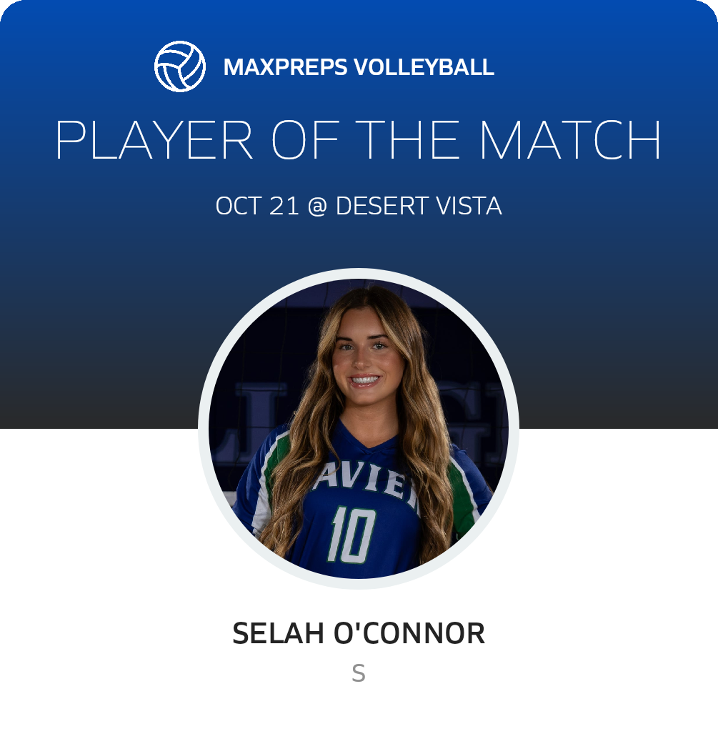 Congratulations to #10 Selah O'Connor for being selected the Xavier College Prep Volleyball Player of the Match.