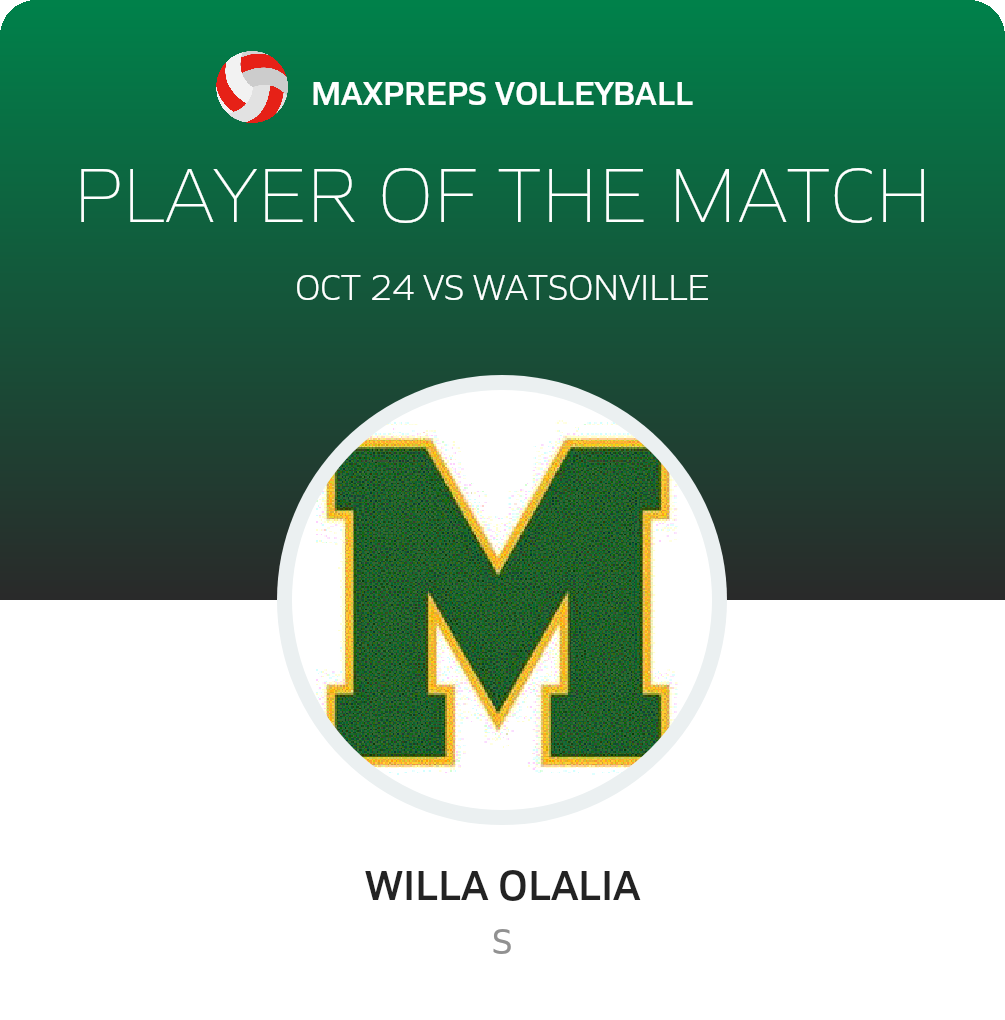 Congratulations to #4 Willa Olalia for being selected the Monterey Volleyball Player of the Match.