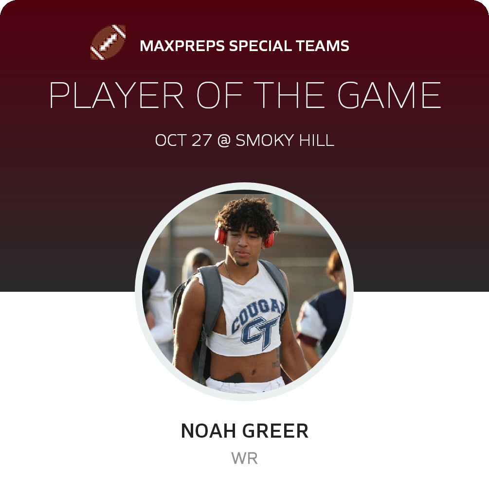 Congratulations to #12 Eliot Ming (overall), #22 Peyton Castro (offensive) and #8 Noah Greer (special teams) for being selected the Cherokee Trail Football Players of the Game.