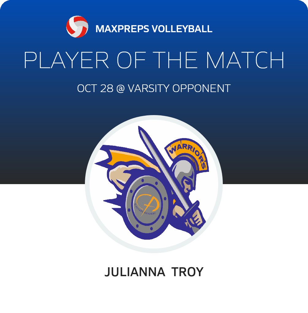 Congratulations to #7 Julianna Troy for being selected the Calvary Academy Volleyball Player of the Match.