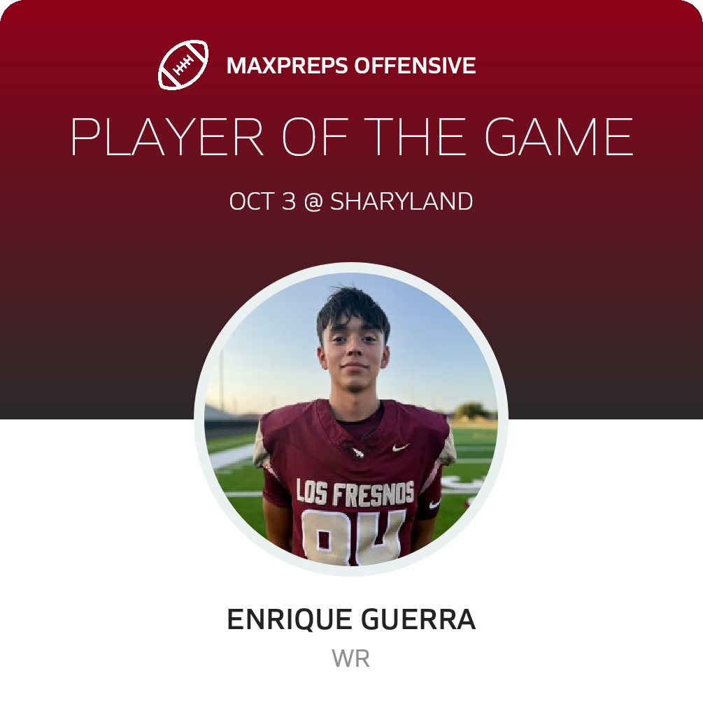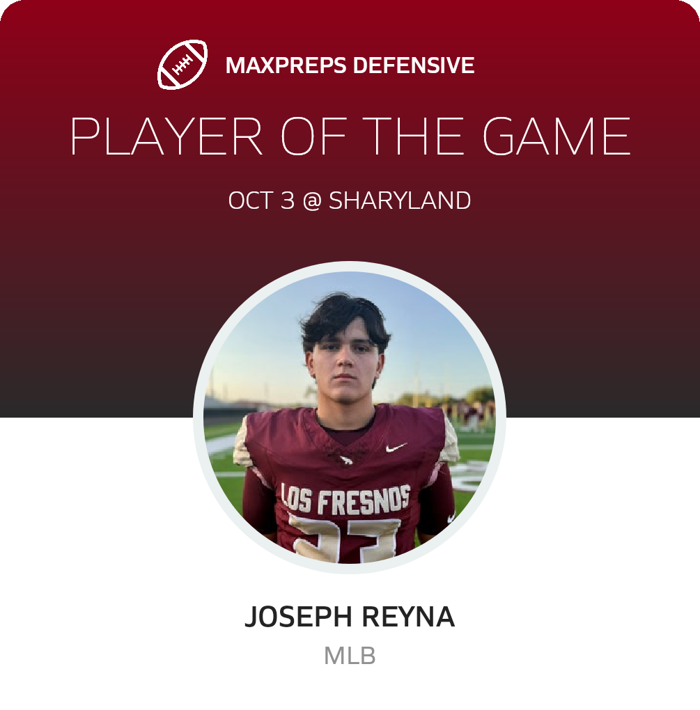 Congratulations to #2 Robert Pineda (overall), #84 Enrique Guerra (offensive), #23 Joseph Reyna (defensive) and #7 Ismael Moreno (special teams) for being selected the Los Fresnos Football Players of the Game.