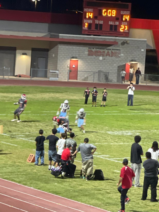The crowd at Thursday's league contest between the Palm Springs Indians (Palm Springs, CA) and the visiting Rancho Mirage Rattlers (Rancho Mirage, CA), witnessed Palm Springs's football squad topple Rancho Mirage by a count of 33-21.