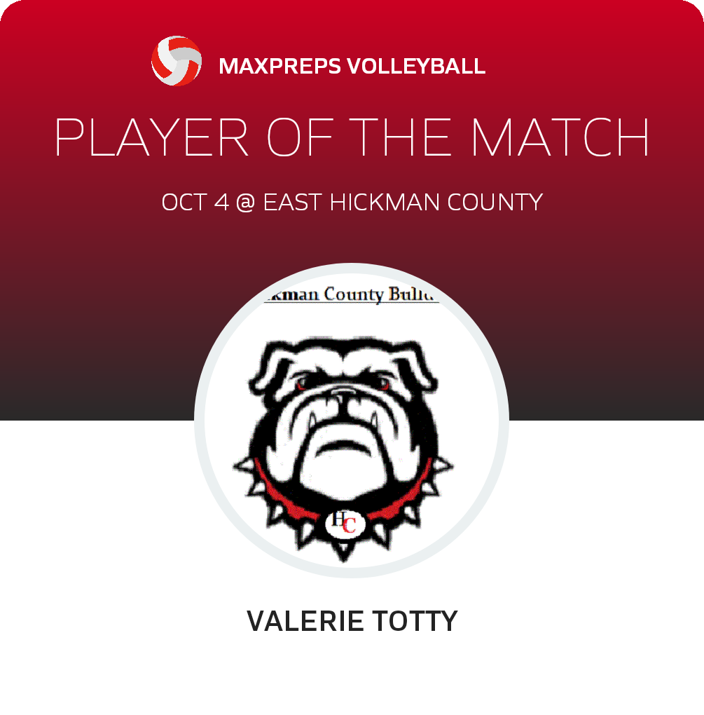 Congratulations to Valerie Totty for being selected the Hickman County Volleyball Player of the Match.