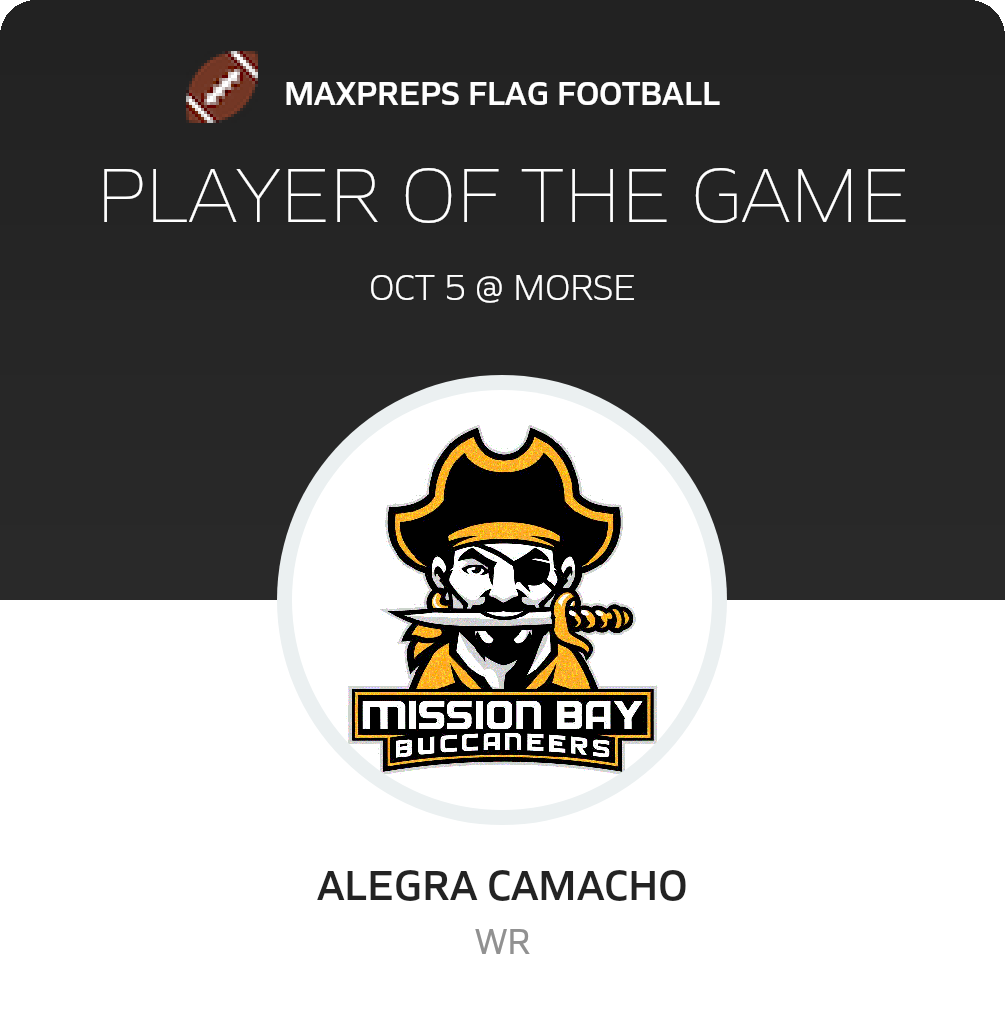 Congratulations to #11 Alegra Camacho for being selected the Mission Bay Girls Flag Football Player of the Game.