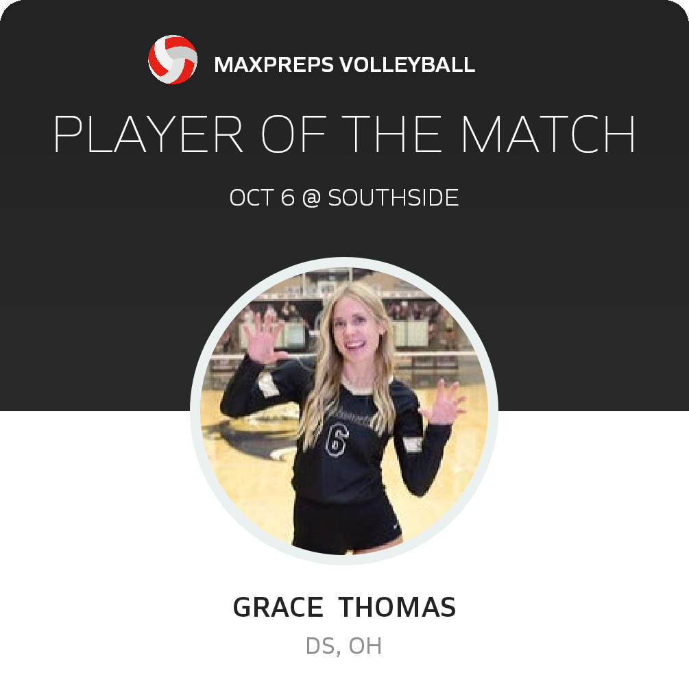 Congratulations to #6 Grace Thomas for being selected the Bentonville JV Volleyball Player of the Match.