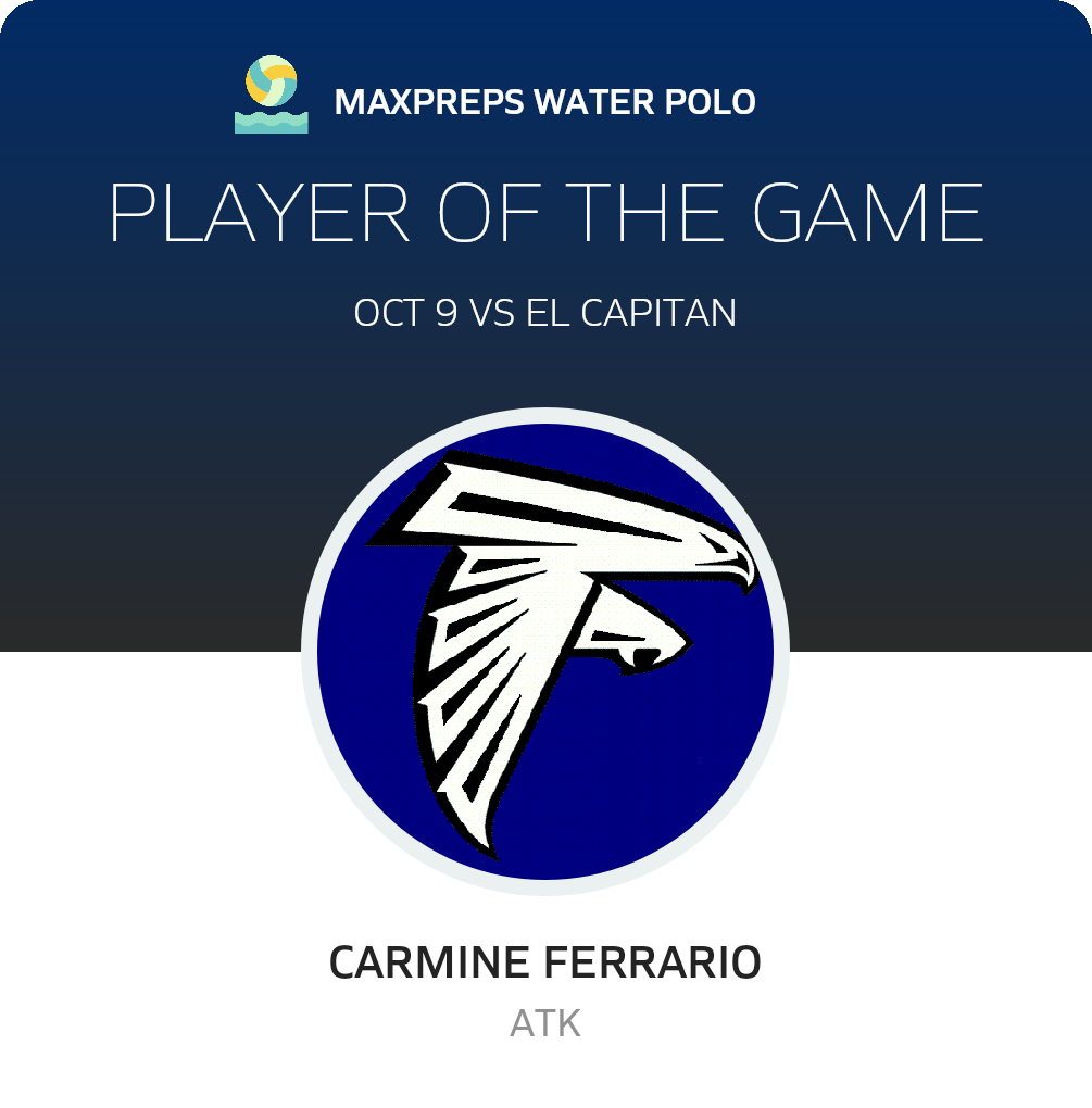 Congratulations to #11 Carmine Ferrario for being selected the Atwater JV Water Polo Player of the Game.