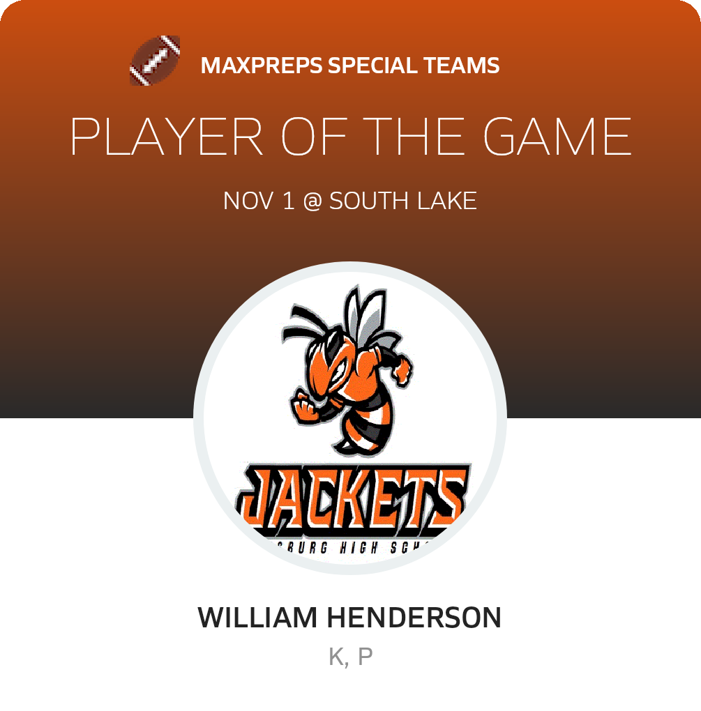 Congratulations to #5 Tre Kelly (overall), #6 Malik Holman (offensive), #59 Jesse Barker jr. (defensive) and #17 Christopher Mckenna (special teams) for being selected the South Lake Football Players of the Game.