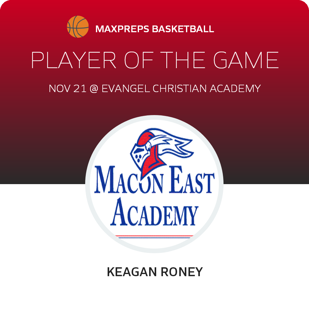 Congratulations to #4 Keagan Roney for being selected the Macon-East Montgomery Academy Basketball Player of the Game.
