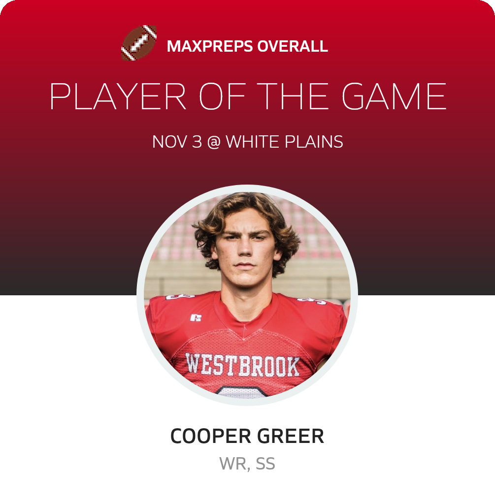 Congratulations to #9 Cooper Greer for being selected the Overall Westbrook Christian Football Player of the Game.