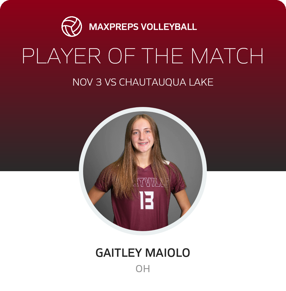 Congratulations to #13 Gaitley Maiolo for being selected the Portville Volleyball Player of the Match.