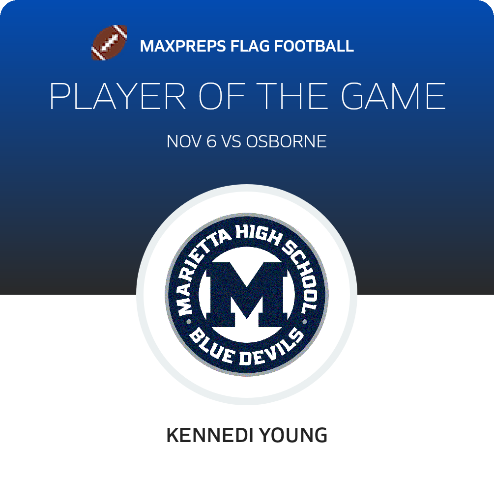 Congratulations to Kennedi Young for being selected the Marietta Girls Flag Football Player of the Game.