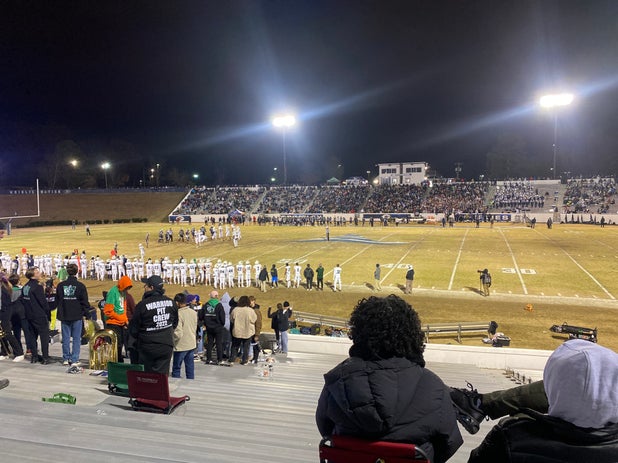 The crowd at Friday's non-league contest between the Grimsley Whirlies (Greensboro, NC) and the visiting Weddington Warriors (Matthews, NC), observed Grimsley's football squad edge Weddington by a count of 28-27.