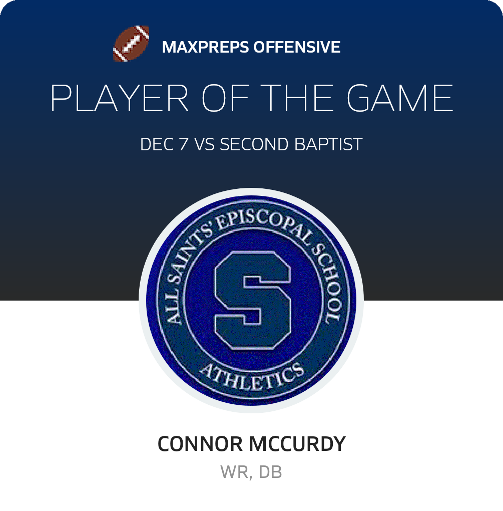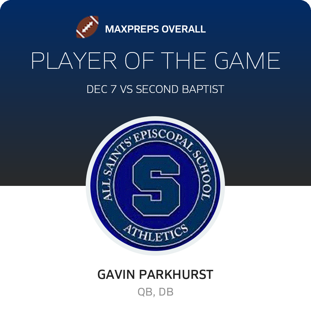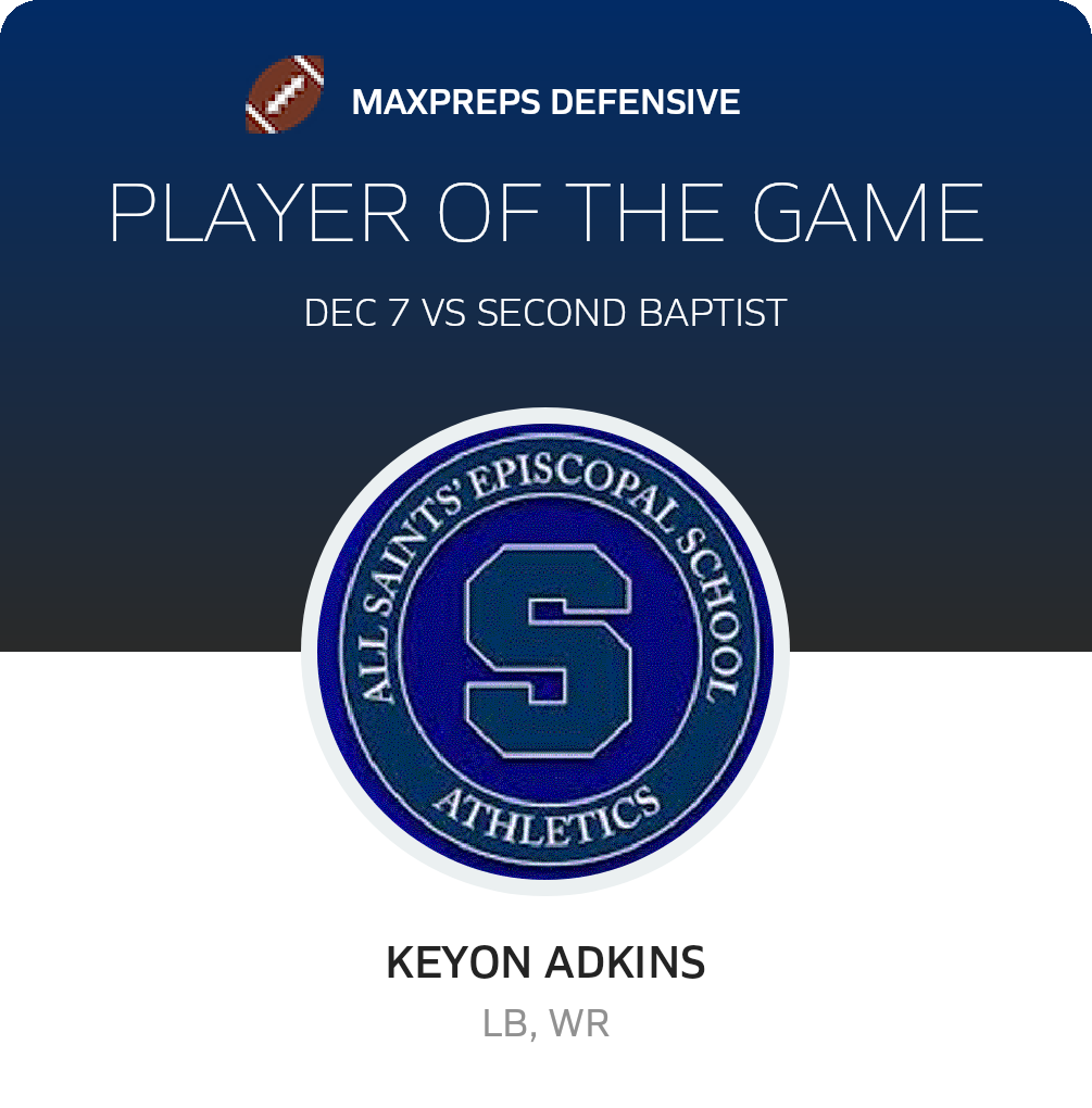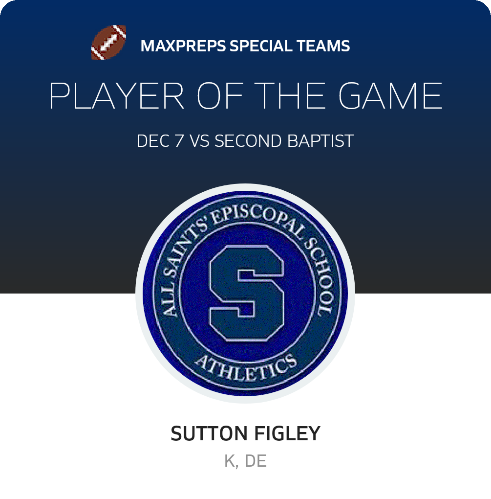 Congratulations to #3 Gavin Parkhurst (overall), #21 Connor Mccurdy (offensive), #4 Keyon Adkins (defensive) and #18 Sutton Figley (special teams) for being selected the All Saints Football Players of the Game.