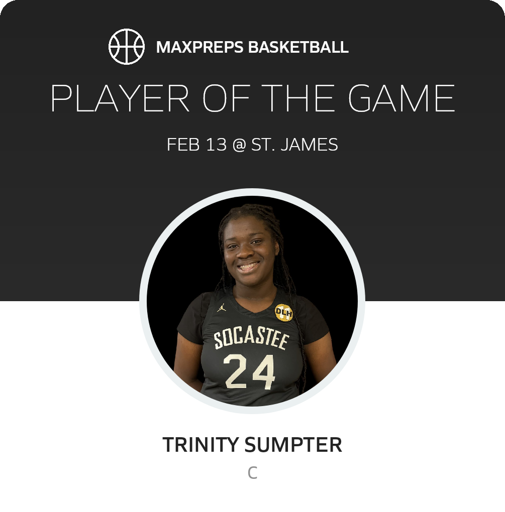 Congratulations to #24 Trinity Sumpter for being selected the Socastee Girls Basketball Player of the Game.