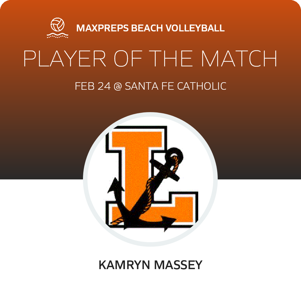 Congratulations to #10 Kamryn Massey for being selected the Lakeland Beach Volleyball Player of the Match.