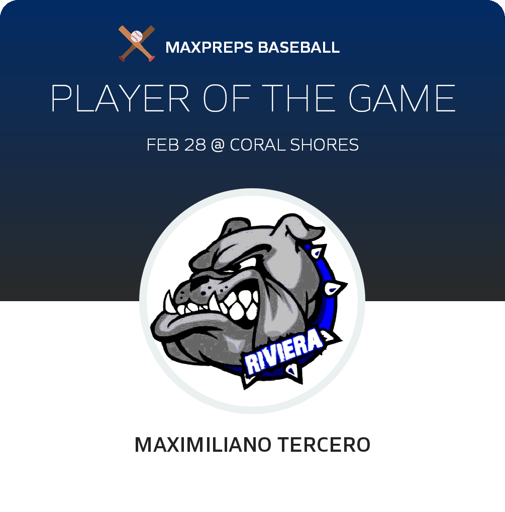 The Riviera Prep Bulldogs (Miami, FL) baseball the host Coral Shores Hurricanes (Tavernier, FL), 3-1 in Monday's non-league contest.