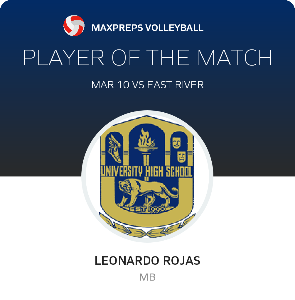 University High School defeated East River High School in straight sets; 25-18, 25-23 and 25-22. Leo Rojas provided a spark off the bench with 5 kills and one ace, while Charles Byrd contributed 5 kills and 3 aces.