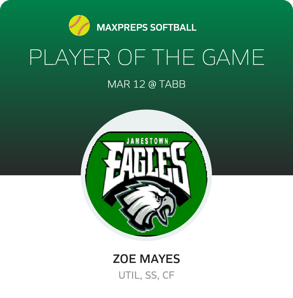 Congratulations to #12 Zoe Mayes for being selected the Jamestown Softball Player of the Game.