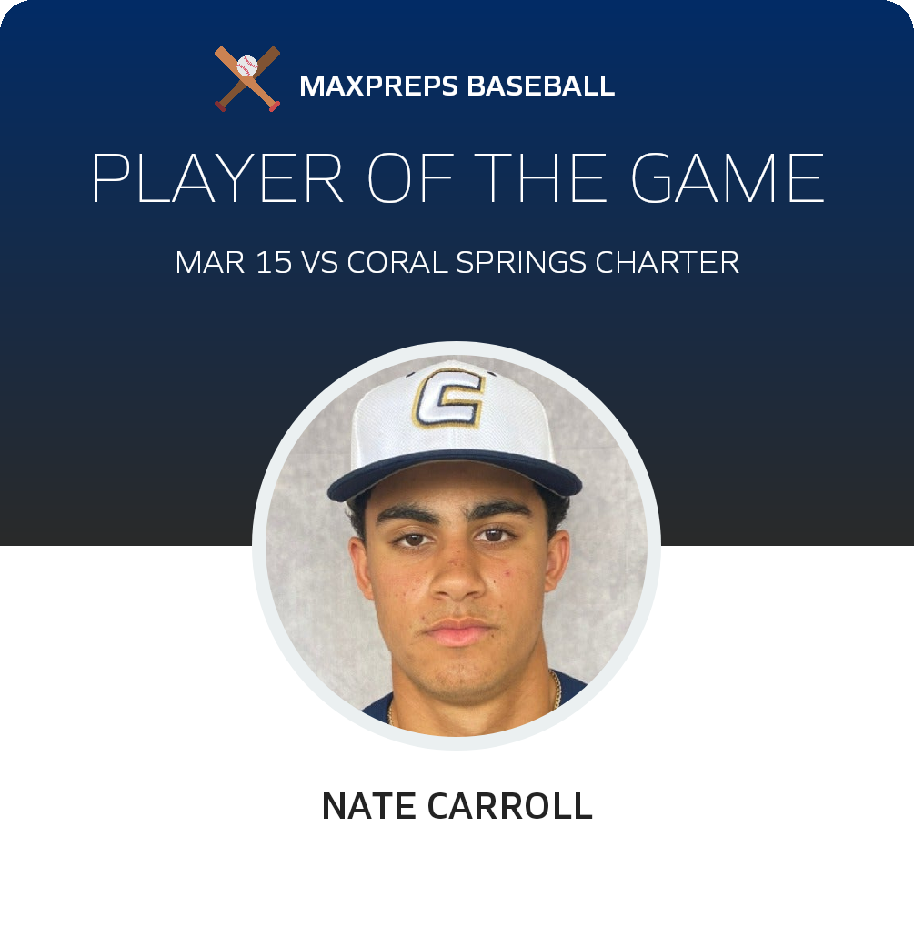 Congratulations to #17 Nate Carroll for being selected the Calvary Christian Academy Baseball Player of the Game.