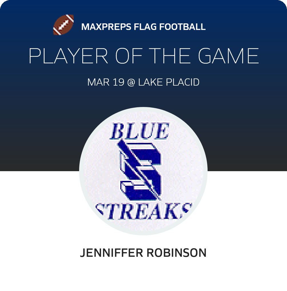 Congratulations to #20 JENNIFFER ROBINSON for being selected the Sebring Girls Flag Football Player of the Game.