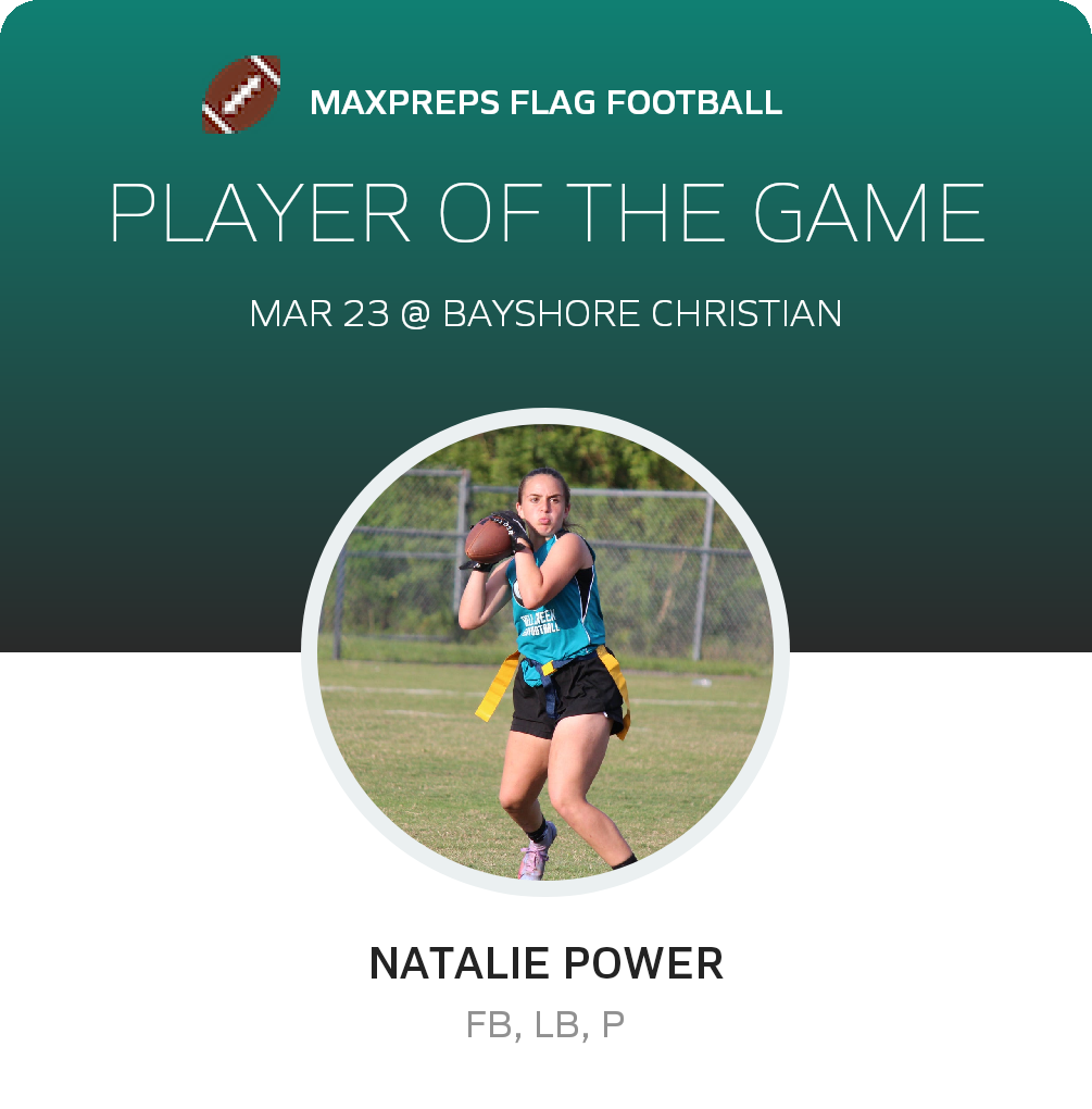 Congratulations to #30 Natalie Power for being selected the Bell Creek Academy Girls Flag Football Player of the Game.