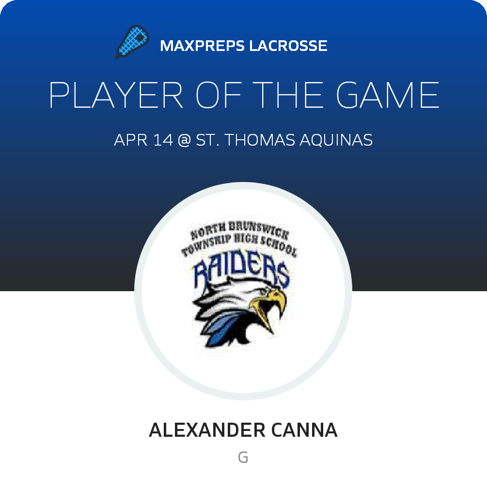 The North Brunswick North Brunswick Raiders lacrosse squad (North Brunswick, NJ), 7-4 in Thursday's league challenge with the host St. Thomas Aquinas Trojans (Edison, NJ)