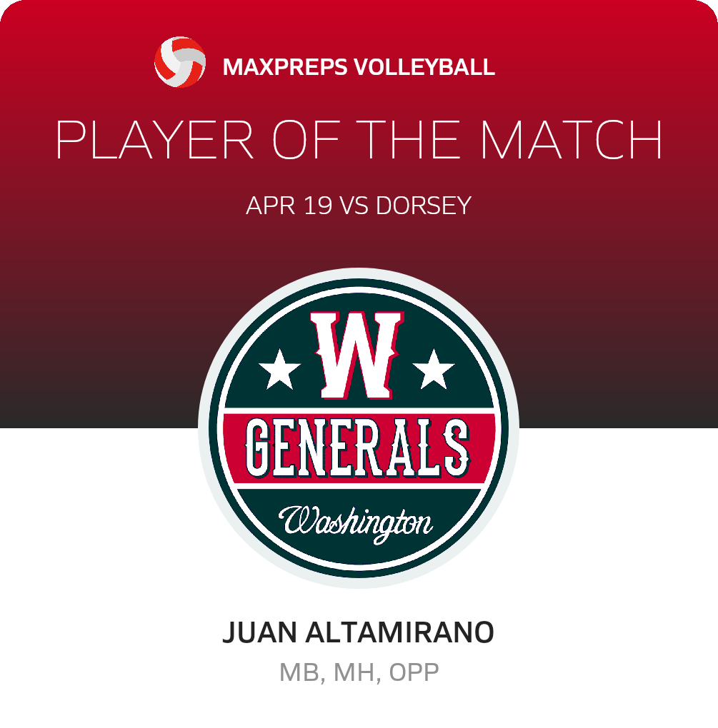 The George Washington Prep Generals volleyball team (Los Angeles, CA), was dropped 3-0 in Wednesday's league challenge with the visiting Dorsey Dons (Los Angeles, CA)