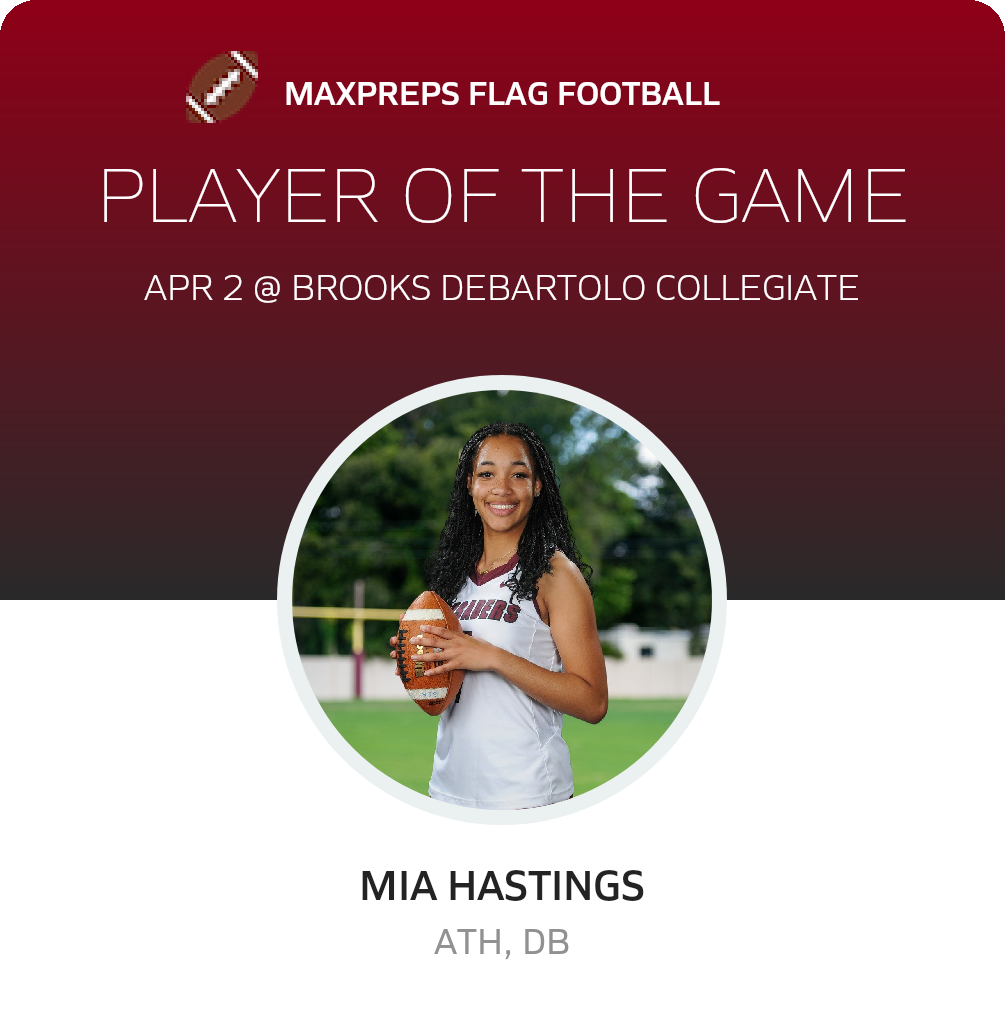 Congratulations to #7 Mia Hastings for being selected the Seffner Christian Girls Flag Football Player of the Game.