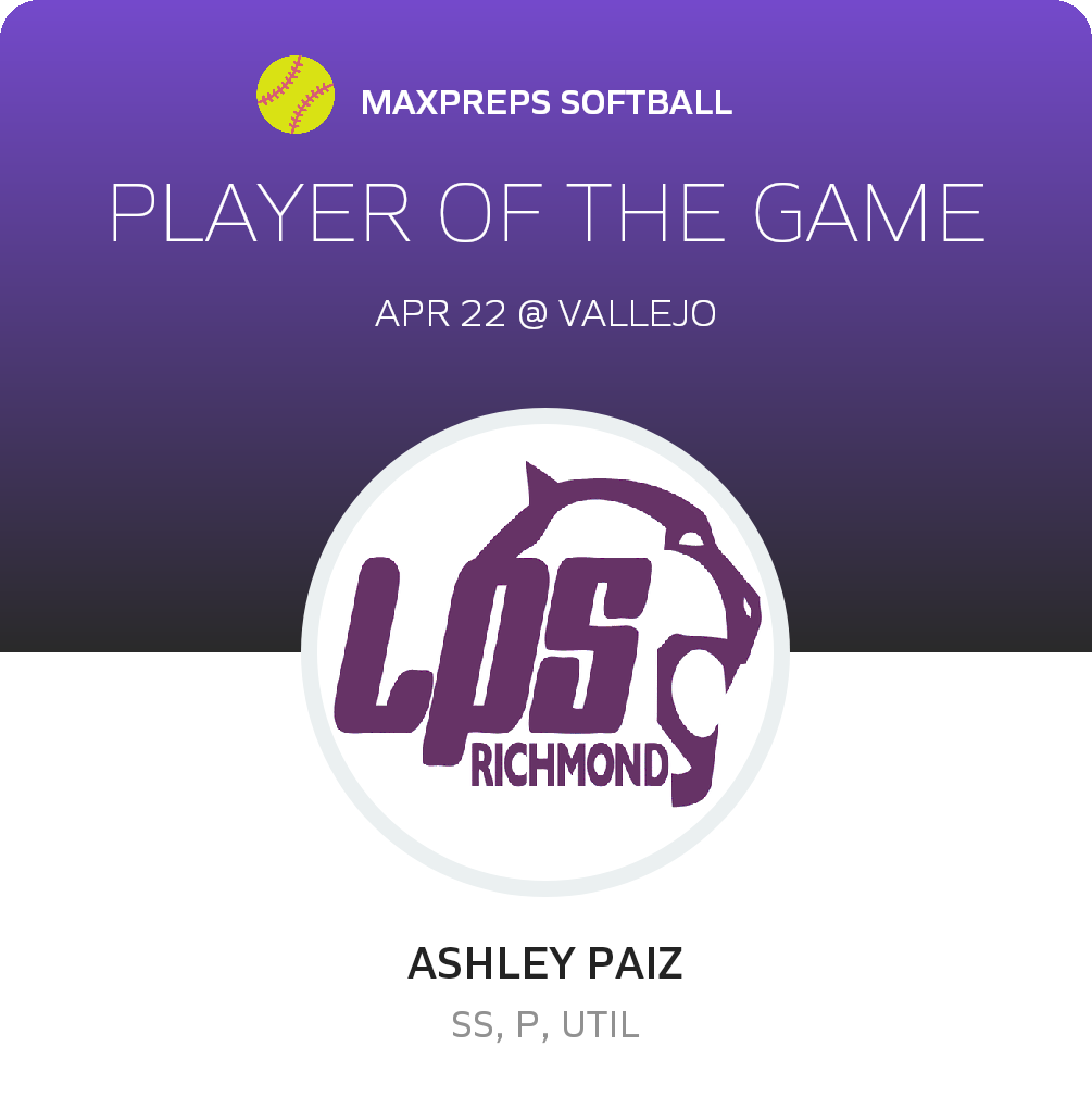 Congratulations to #17 Ashley Paiz for being selected the Leadership Public Schools Richmond Softball Player of the Game.